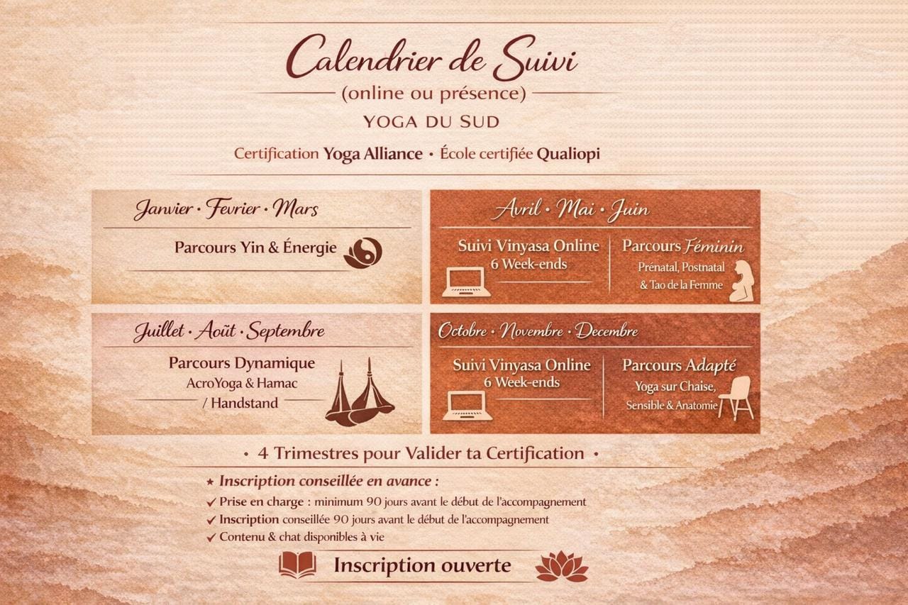 Aujourd’hui, il existe une multitude de formations en yoga, mais peu d’entre elles offrent un véritable accompagnement, une spécialisation concrète et la flexibilité nécessaire pour s’adapter à ton rythme.