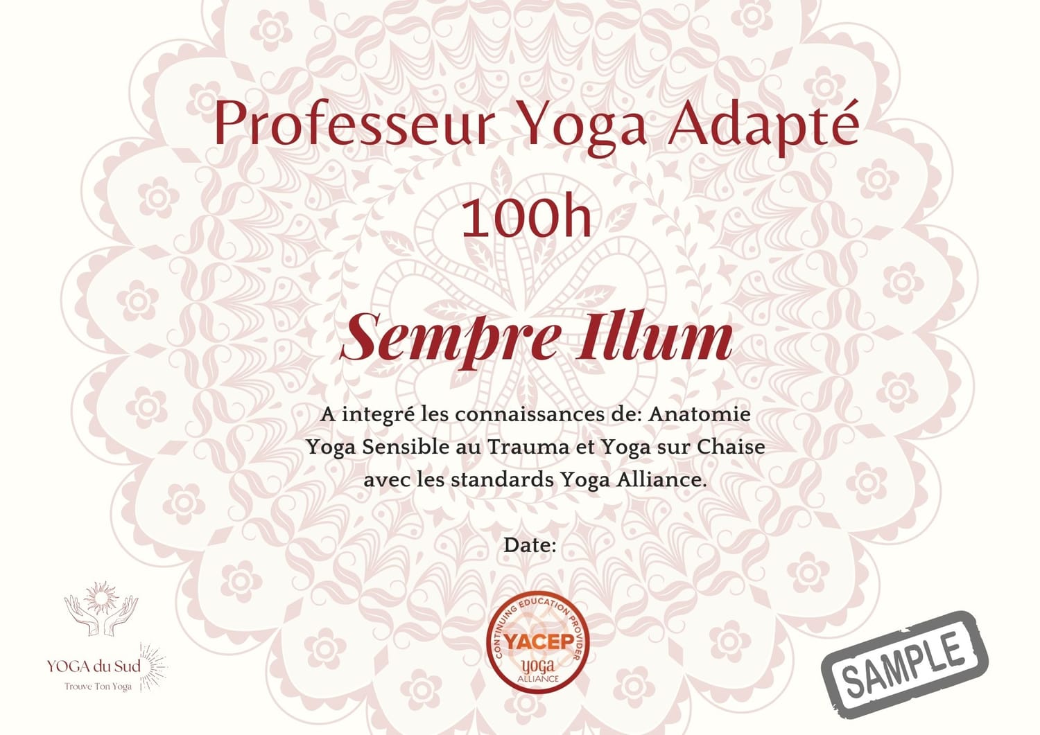 Un diplôme Yoga Alliance 100h YACEP, reconnu internationalement.